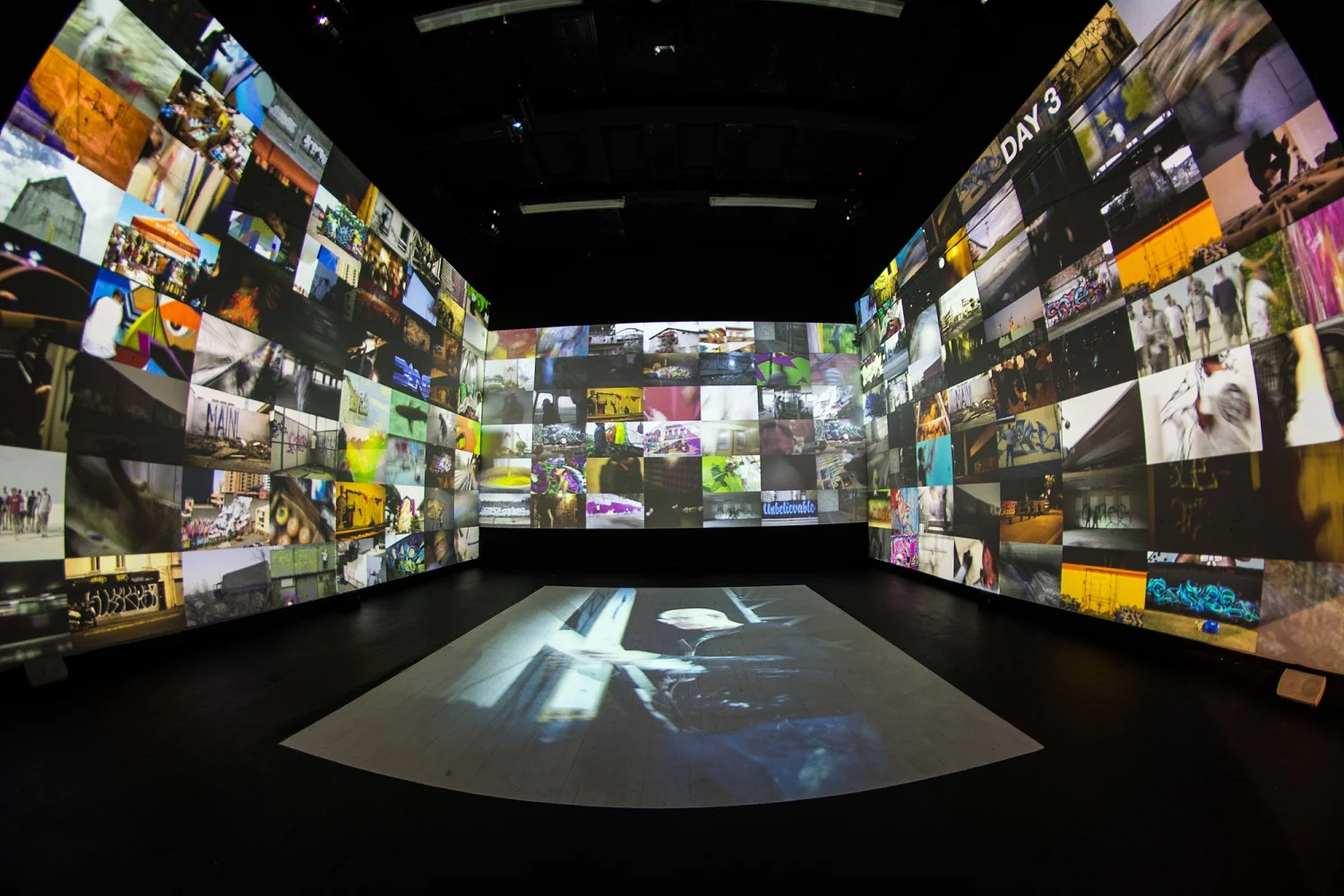 Immersive experience showcasing Selina Mile's videography. Nine projectors were deployed that ran 170 video channels across three walls and further one that projected interviews with all of the headline artists onto the floor.