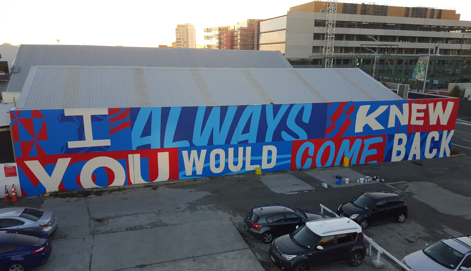 WHAT: The Christchurch Earthquake Recovery Authority (CERA) asked Oi YOU! to conceptualise and deliver a street art project that would engage the Christchurch Public. Under the name of Word Up, people were asked to submit a phrase that reflected how they felt about the city. We received over 350 entries, the winner being "I always knew you would come back". Sydney artist Numbskull painted the chosen words.